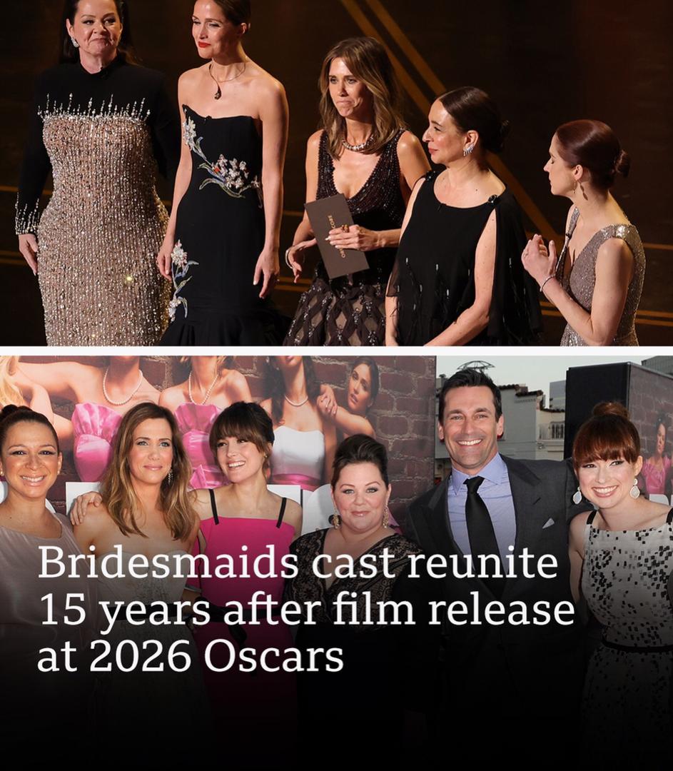 Bridesmaids stars reunite at 2026 Oscars to mark film’s 15th anniversary Several stars of the hit comedy Bridesmaids reunited on stage at the Academy Awards to celebrate the film’s 15th anniversary.Actors Melissa McCarthy, Rose Byrne, Kristen Wiig, Maya Rudolph, and Ellie Kemper appeared together on stage during the 2026 Oscars ceremony, delighting fans with their surprise reunion. The actresses were part of the original cast of Bridesmaids, the 2011 comedy that became a major box-office success and earned critical acclaim. The film was widely praised for its ensemble cast and fresh approach to female-led comedy.
