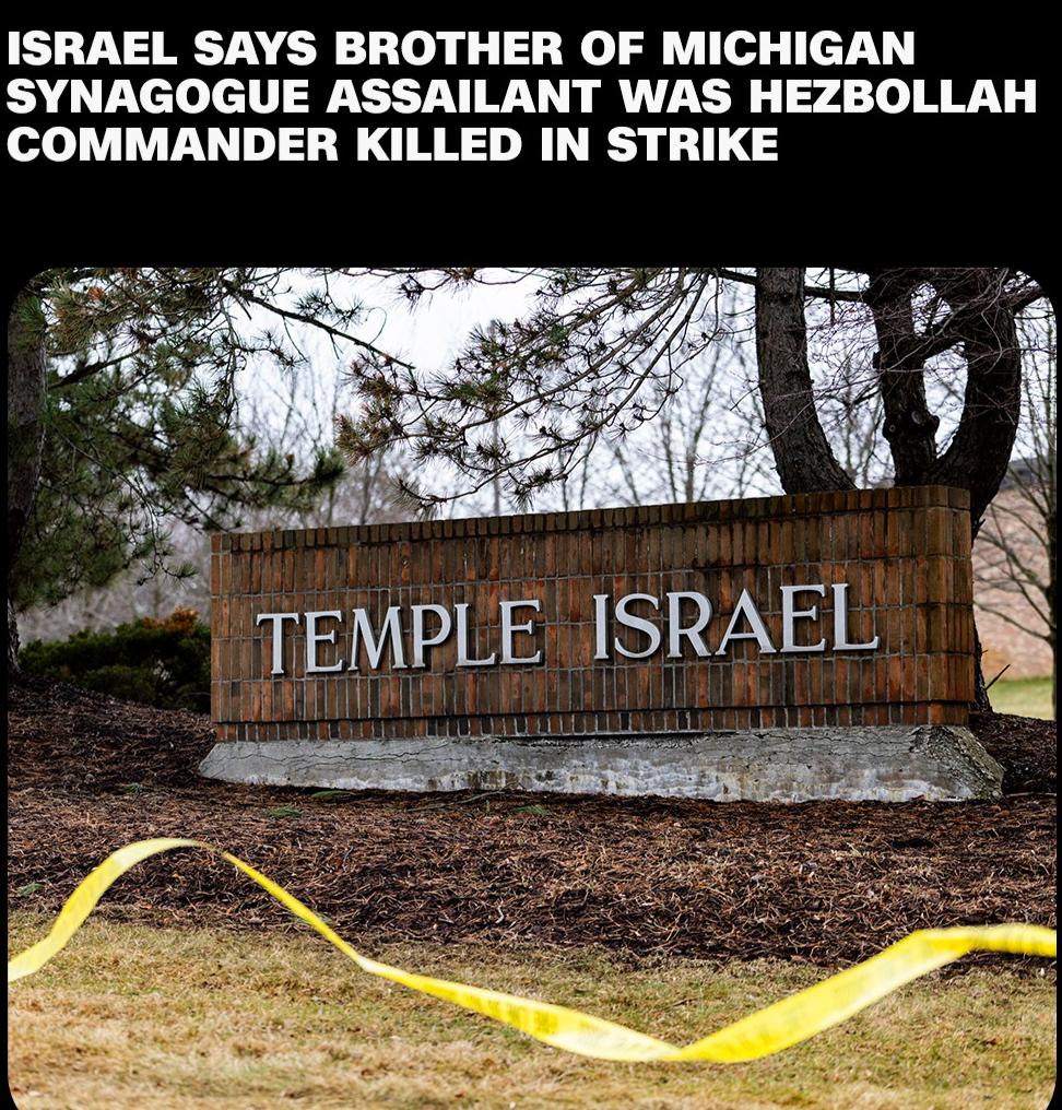 Brother of Michigan synagogue assailant was a Hezbollah commander, Israeli military says The Israeli military has said that the brother of the man who carried out an attack on a synagogue in Michigan was a commander in the Lebanese militant group Hezbollah, and was killed in a strike in Lebanon last week.