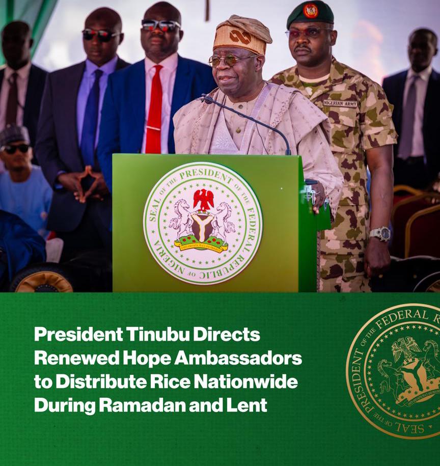 President Tinubu Directs Renewed Hope Ambassadors to Distribute Rice Nationwide During Ramadan and Lent President Bola Ahmed Tinubu has directed the Renewed Hope Ambassadors to begin the nationwide distribution of rice to Nigerians observing the holy seasons of Ramadan and Lent. The directive aims to provide support to millions of citizens across the country who […]