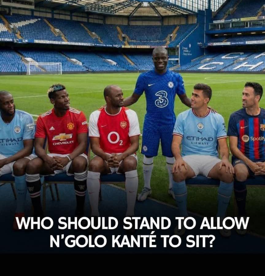 Who Should Stand Up So Kanté Can Take A Seat A humorous football debate has gone viral on social media asking which midfield great should give up a seat for N’Golo Kanté, with fans choosing between several legendary and modern stars in a light-hearted poll. The question, which circulated widely on football platforms and fan pages, asked: “Who should stand up to allow N’Golo Kanté to take a seat accompanied by a list of elite midfielders.