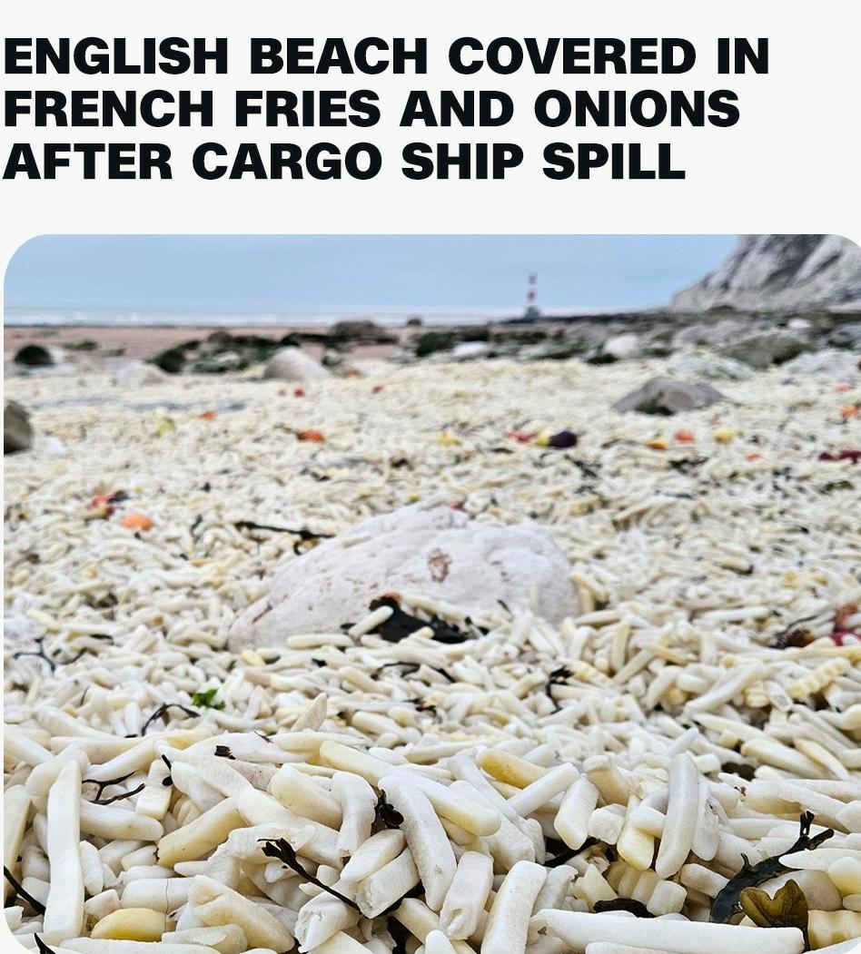 English Beach Disappears Under Seas of French Fries & Onions After Container Ship Spill East Sussex, UK A stretch of beach in Eastbourne, southeast England has been transformed into a surreal landscape of uncooked French fries and onions after dozens of shipping containers plunged into the sea during recent storms, spilling their cargo along the shoreline. Chips Everywhere, Onions Too Volunteers and local residents were left stunned over the weekend when thousands of bags of uncooked chips (French fries) and onions washed ashore on Falling Sands near Beachy Head — so thick in places that the beach took on a bizarre, golden-sand illusion from afar. “I had to look twice,” said resident Joel Bonnici, who was out walking with his partner when they rounded a corner and found chips and chip bags stretching toward the lighthouse.