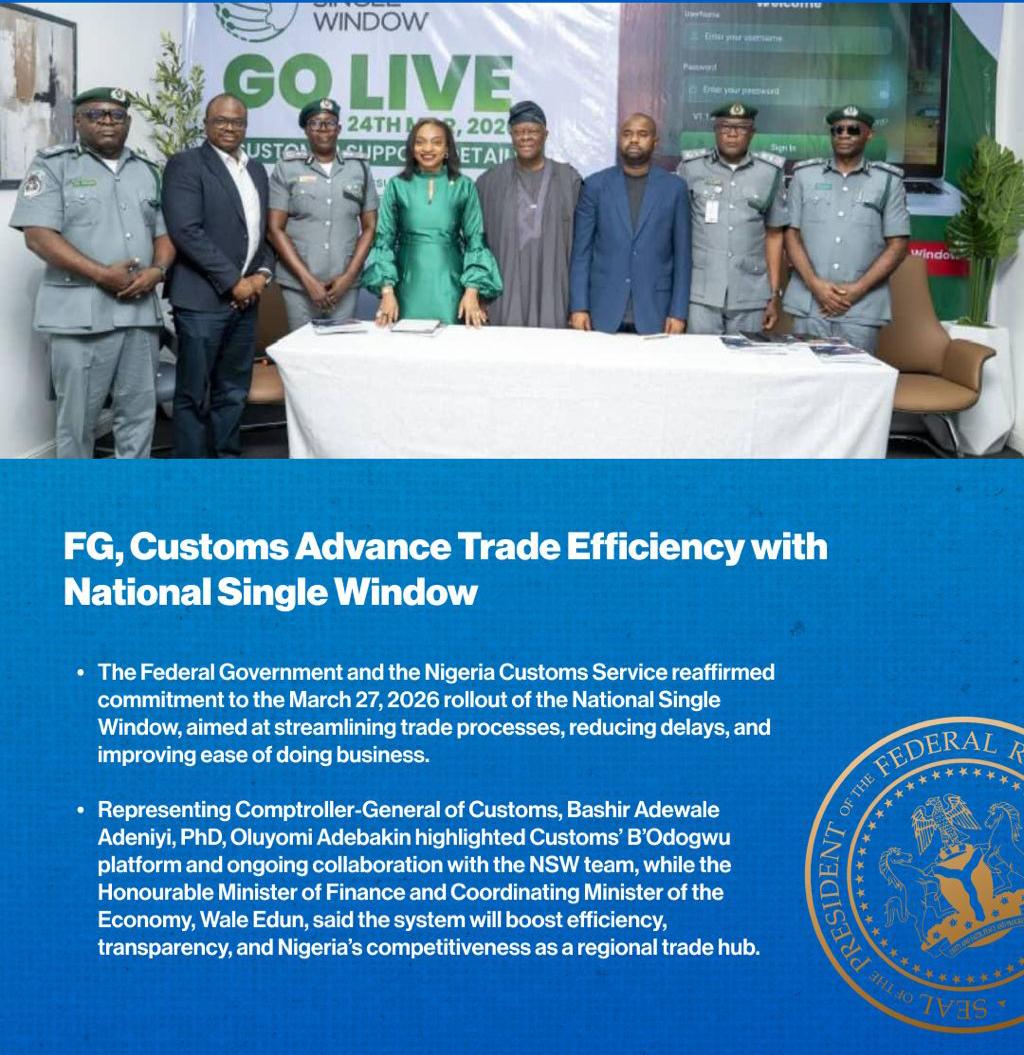 The Federal Government (FG) has taken a major step to enhance trade efficiency, simplify import‑export procedures and modernise Nigeria’s trade ecosystem with the launch of the National Single Window (NSW) platform, a digital trade facilitation initiative designed to streamline processes and boost economic competitiveness. The President’s Chief of Staff, Femi Gbajabiamila, described the NSW platform as a “monumental step” toward transforming the country’s trade logistics and operating environment, saying it aligns with the broader trade and economic reforms under President Bola Ahmed Tinubu’s Renewed Hope Agenda. Scheduled to be launched on March 27, 2026, the NSW is anticipated to fundamentally change how importers, exporters and government agencies interact with customs and regulatory processes by providing a single digital entry point for all trade‑related documentation and clearances.