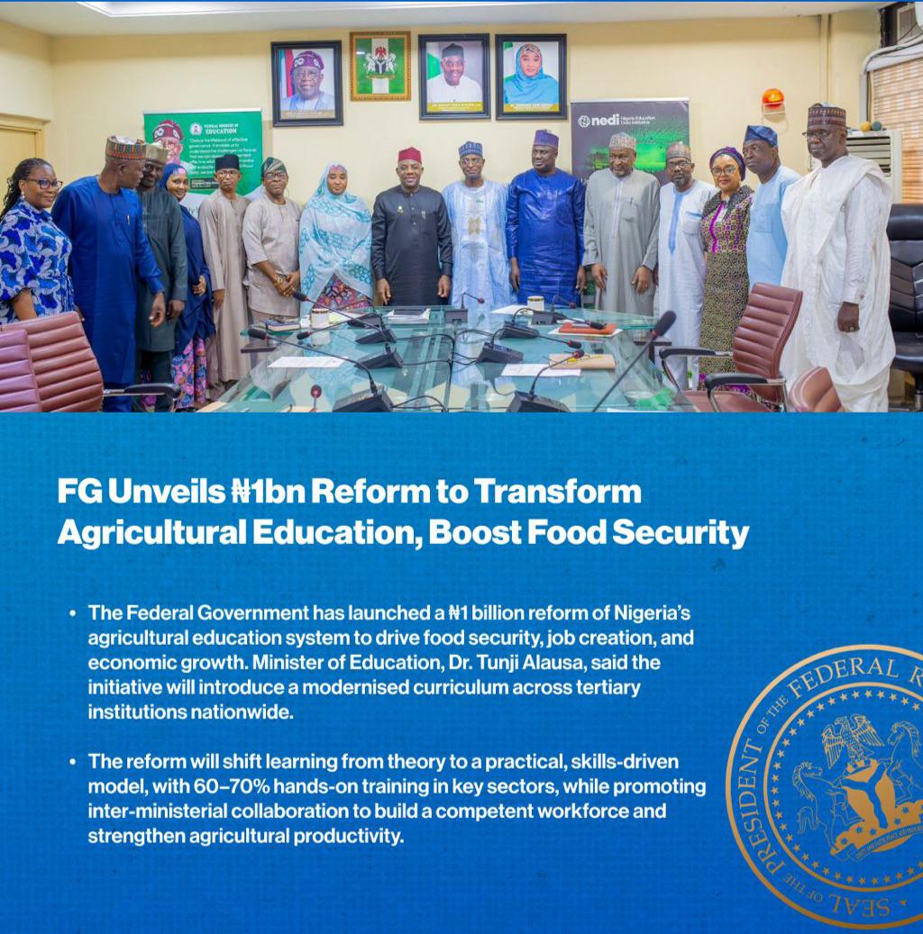 The programme will also promote stronger linkages between academia, industry and farming communities, ensuring that graduates are not only theoretically grounded but also industry ready and capable of driving productivity across the agricultural value chain. According to the government, part of the ₦1 billion investment will be channelled into training educators, providing modern equipment, supporting agribusiness incubation centres, and facilitating partnerships with private sector stakeholders and development partners. The initiative further aims to encourage youth participation in agriculture, addressing unemployment while fostering innovation and entrepreneurship in areas such as agro-processing, storage, logistics and value addition. Officials stressed that enhancing agricultural education is essential to improving food systems, reducing import dependence, and strengthening national resilience against global supply shocks. The reform aligns with the policy direction of President Bola Ahmed Tinubu, whose administration has prioritised food security, economic diversification and human capital development under the Renewed Hope Agenda. Stakeholders have welcomed the initiative as a timely intervention, noting that investment in agricultural knowledge systems will play a pivotal role in unlocking Nigeria’s vast agricultural potential and ensuring long-term food sustainability. The Federal Government reaffirmed its commitment to implementing the reform with measurable outcomes, positioning agricultural education as a cornerstone for national prosperity and inclusive growth.