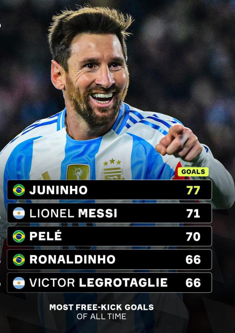 The all‑time leader in free‑kick goals, Juninho Pernambucano, scored 77 direct free‑kick goals over the course of his professional career a record widely recognised among statisticians and historians. With Messi currently six free‑kick goals shy of Juninho’s mark, the question among fans and pundits is whether he can surpass that number before the end of his playing career.