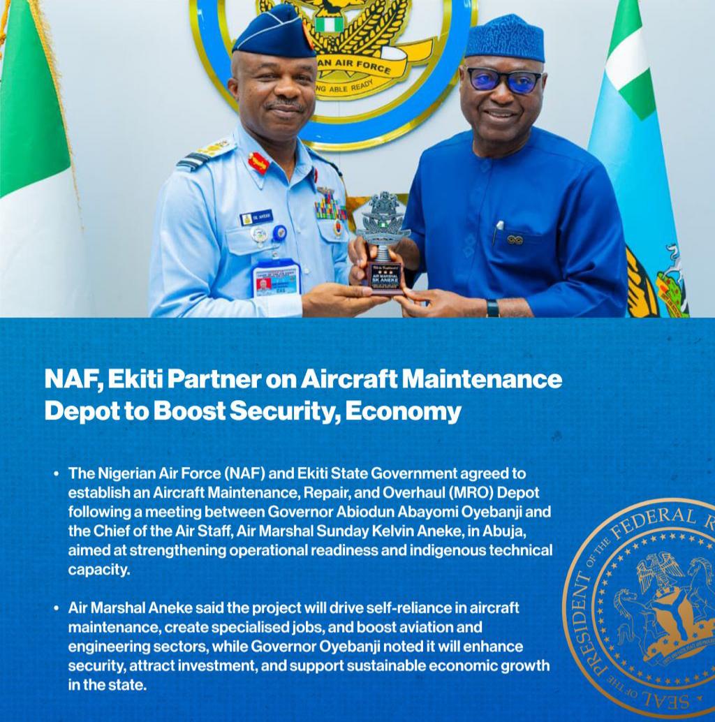 NAF, Ekiti Partner on Aircraft Maintenance Depot to Boost Security, Economy The Federal Government of Nigeria, through the Nigerian Air Force (NAF), and the Ekiti State Government have signed a strategic partnership to establish an Aircraft Maintenance, Repair and Overhaul (MRO) Depot aimed at strengthening national security, building technical capacity, stimulating economic growth, and creating skilled employment opportunities. The pact was formalised on Thursday during a courtesy visit by the Ekiti State Governor, Mr. Abiodun Abayomi Oyebanji, to the Chief of the Air Staff, Air Marshal Sunday Kelvin Aneke, at the NAF Headquarters in Abuja. Air Marshal Aneke described the initiative as a significant milestone toward achieving greater self‑reliance in aircraft maintenance and enhancing Nigeria’s airpower projection and operational readiness. He explained that the facility will not only support military aircraft sustainability but also spur technical expertise and advance Nigeria’s aviation industry.