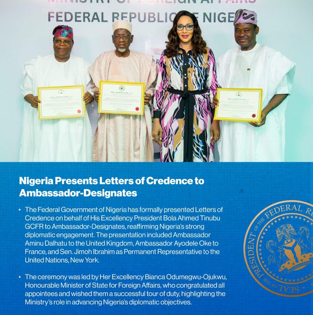 Government officials noted that the appointments reflect the administration’s effort to reposition Nigeria’s diplomatic missions to promote economic diplomacy, attract foreign investment, and advance national interests abroad. The newly designated ambassadors were charged to uphold professionalism, integrity, and patriotism while projecting Nigeria’s image positively on the global stage During the ceremony, the ambassadors were encouraged to focus on: