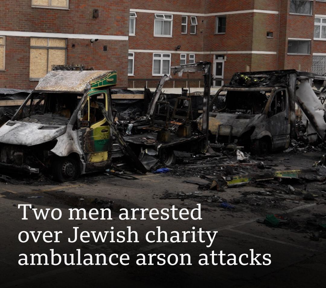 Two men arrested over arson attack on Jewish charity ambulances in London Two men aged 47 and 45 have been arrested in connection with an arson attack on ambulances belonging to a Jewish charity in London.